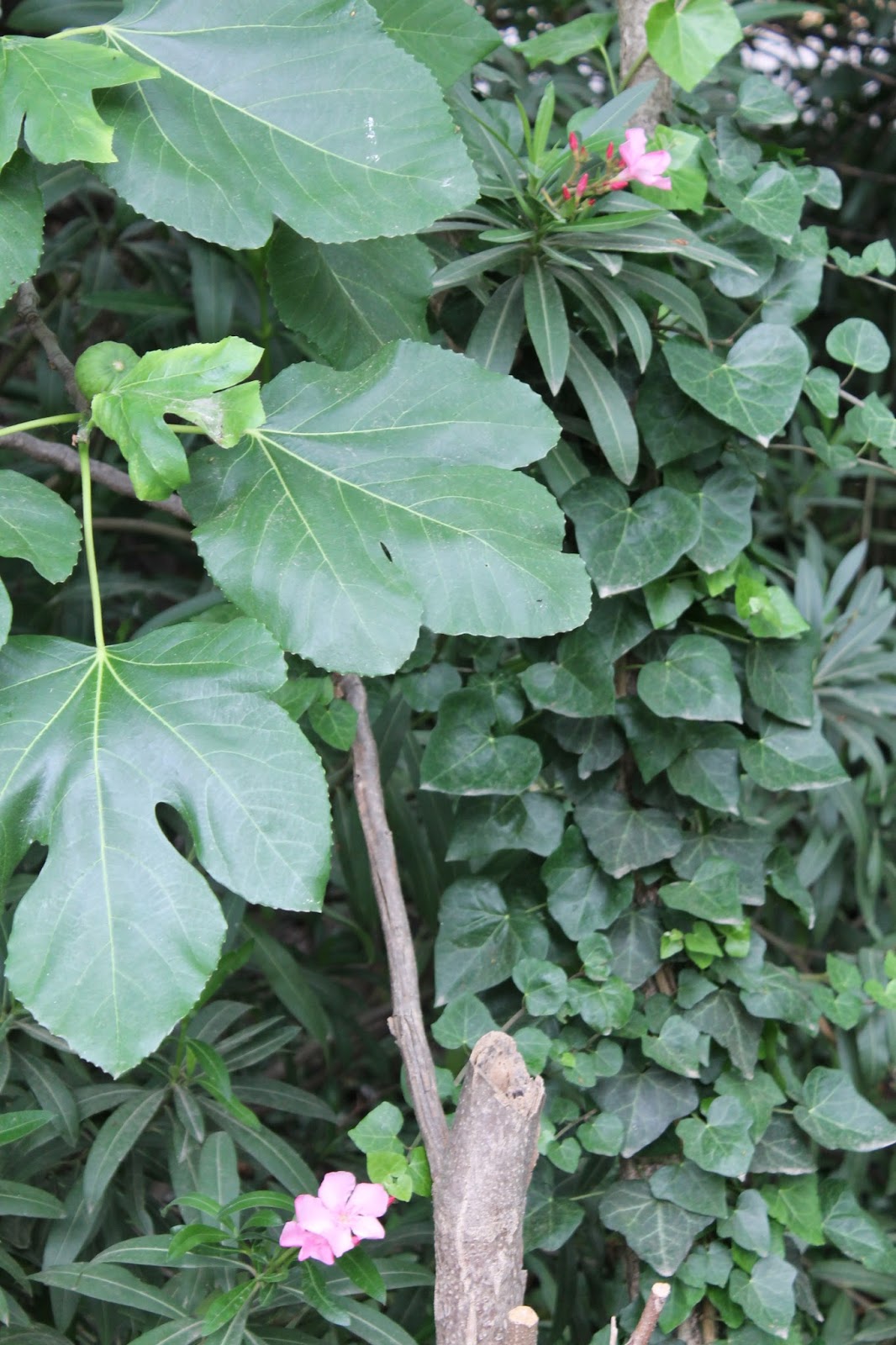 two or three mulberry trees, oleanders, a variety of shrubs including some pittosporum tobira that have become trees